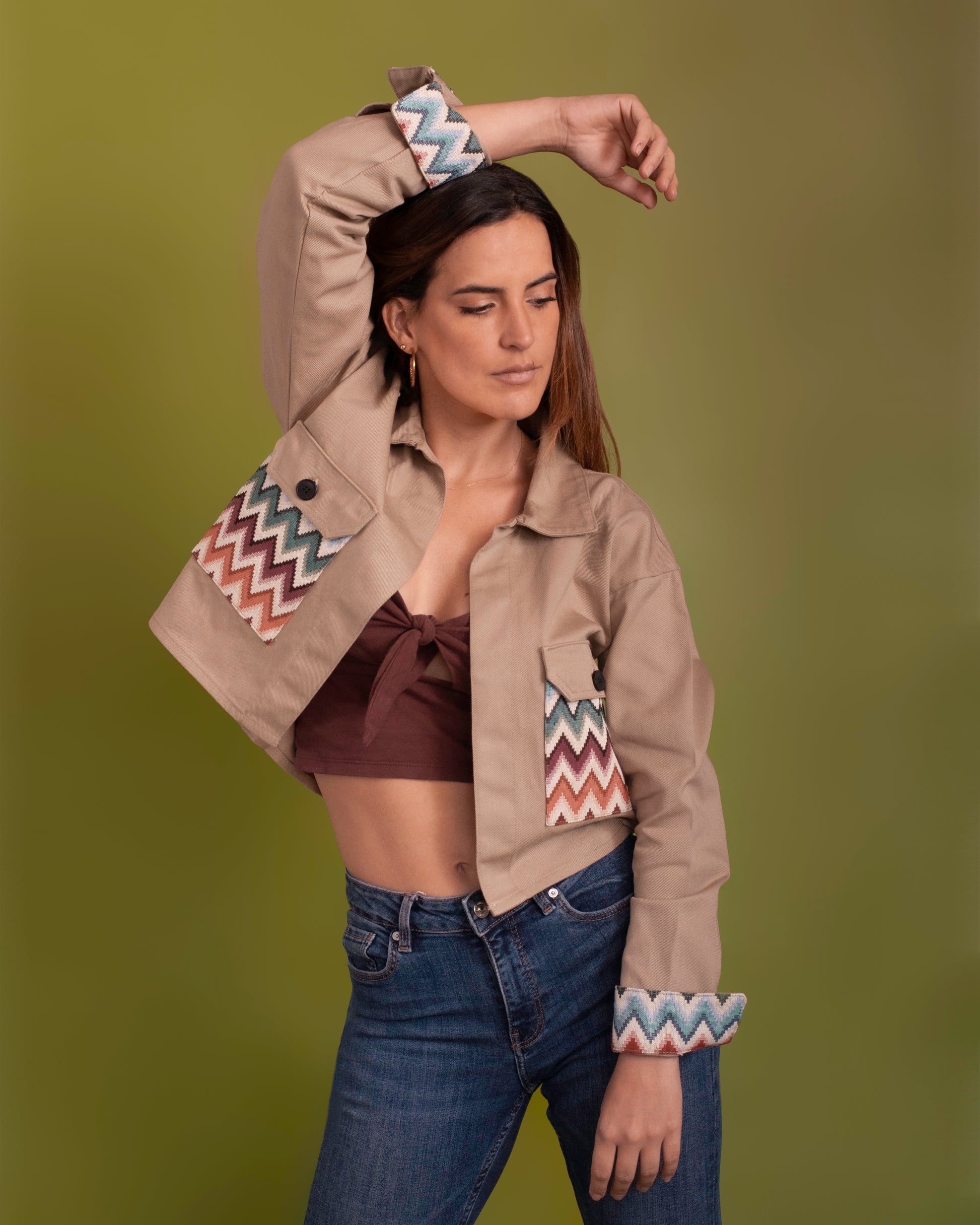 La chaqueta oversize Ísola es imprescindible para completar tu look. Con dos bolsillos internos y dos externo de parche con tapa. Su tela tejida en telar en puños y bolsillos le dan un toque único.